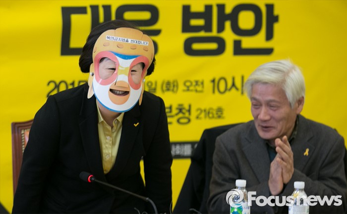 (서울=포커스뉴스) 1일 오전 서울 여의도 국회에서 정의당과 민변 주최로 열린 복면금지법의 문제점 토론회에 참석한 심상정 상임대표가 가면을 쓴 채 입장하고 있다. 오른쪽은 김세균 공동대표.