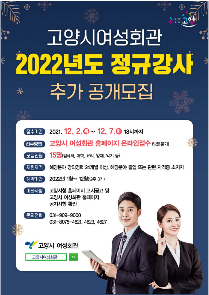[부자동네타임즈 김인수기자] 고양시 여성회관이 기존 1백여 개 정규 강좌 외에 15개 추가 강좌를 개설하며 이에 따라 정규강사 15명을 추가 공개 모집한다.