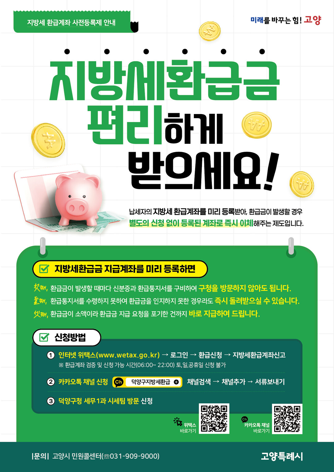 신청방법은 인터넷 위택스을 통해 지방세 환급계좌를 신고하거나, 환급금 지급계좌 개설 신고서를 작성해 신분증을 첨부하여 카카오톡 채널(ID: 덕양구지방세환급)로 편리하게 신청할 수 있으며, 방문, 팩스, 우편 신청도 가능하다.
