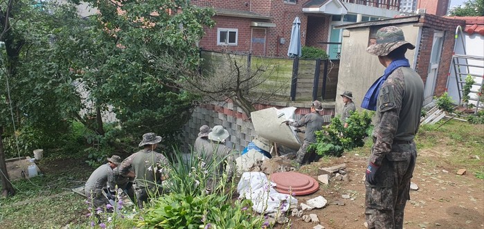 덕양구청 안전건설과로부터 굴삭기 등 장비를 지원 받아 콘크리트 담장을 부수고 장병들이 직접 폐기물을 수거 차량까지 옮기는 작업을 반복했다.