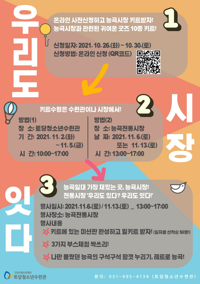 이번 프로그램은 11월 6일과 13일 오후 1시부터 5시까지 능곡전통시장에서 진행되며 고양시 청소년들과 지역주민을 대상으로 전통시장 활동 키트를 제작 배포하고 다양한 부스체험을 진행한다. ‘우리도 시장 잇다’ 참가 청소년들은 직접 제작한 로고와 마스코트로 10여종의 다양한 굿즈를 만들어 전통시장 활동 키트를 구성하였으며, 10월 26일부터 29일까지 온라인 사전 신청을 통해 수령할 수 있다.