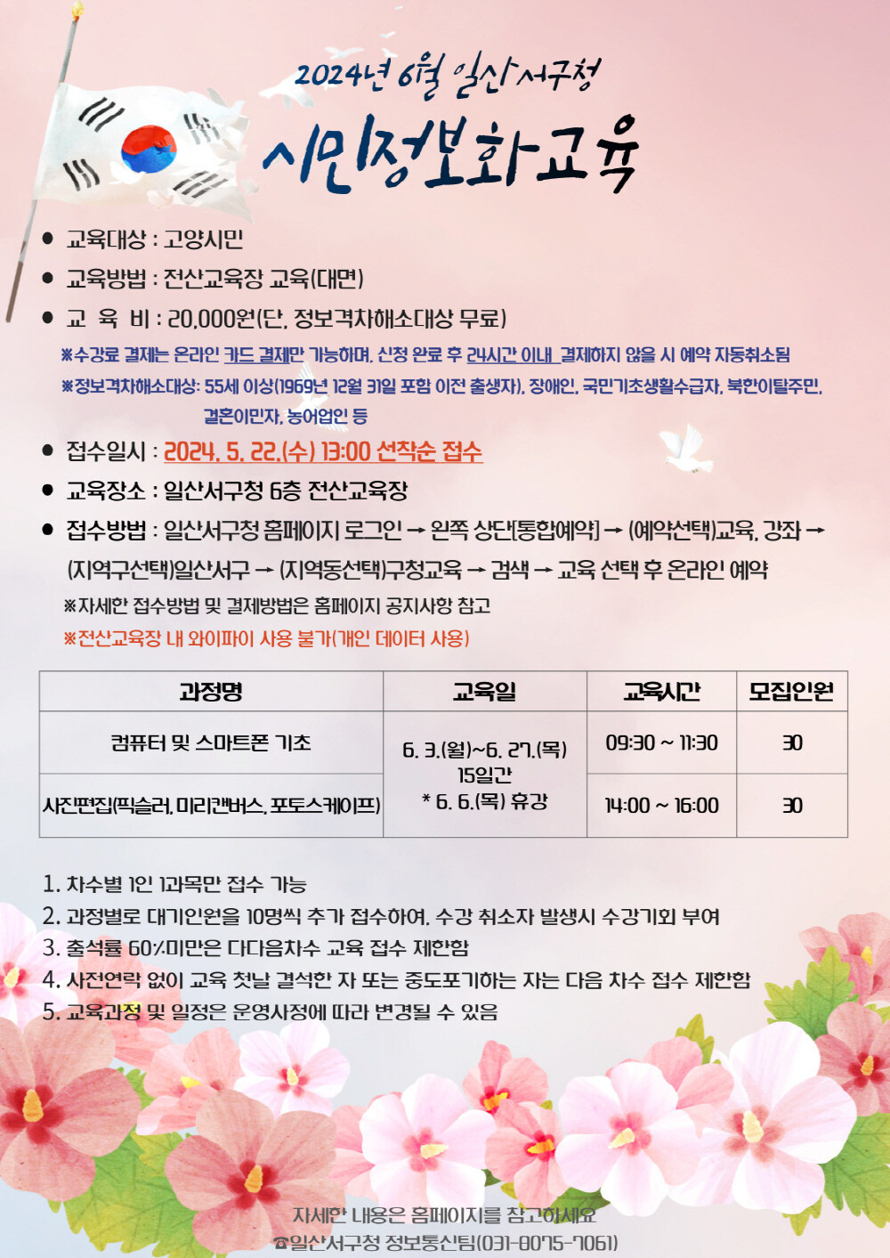 교육은 일산서구청 누리집 통합예약-교육·강좌-정보화교육 게시판을 통한 온라인 신청이 가능하며 22일부터 선착순으로 모집한다.