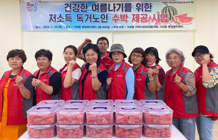 이번 특화사업은 무더위에 지치기 쉬운 여름철, 스스로 준비하기 어려운 수박을 관내 저소득 독거노인에게 제공함으로써 건강한 여름을 날 수 있도록 하고자 가좌동 지역사회보장협의체 위원들이 뜻을 모아 기획했다.