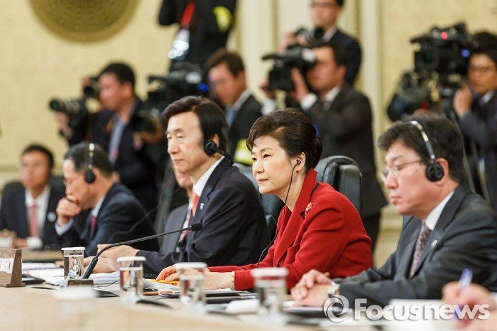 | △ 한일 정상의 확대 정상회담이 2일 오전 11시 7분에 시작돼 11시 45분 종료됐다. 박근혜 대통령은 모두 발언을 통해 "외교에서 신뢰를 가장 중요하게 생각한다"고 강조했다. 사진은 1일 한일중 정상회담 장면.<사진제공=청와대> |