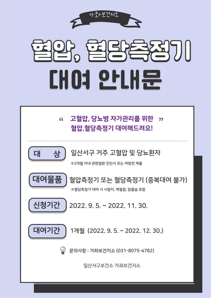 [부자동네타임즈 김인수기자] 고양특례시(시장 이동환) 일산서구보건소 가좌보건지소에서 일산서구 거주 주민들 중 고혈압 및 당뇨환자를 위해 혈압계와 혈당측정기를 무료로 대여한다.