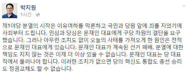 박 의원은 이어 "민심과 당심은 문재인 대표에게 구당 차원의 결단을 요구했다. 그러나 아무런 조치도 없이 사태를 가져오게 한 원인은 전적으로 문재인 대표에게 있다"고 덧붙였다.