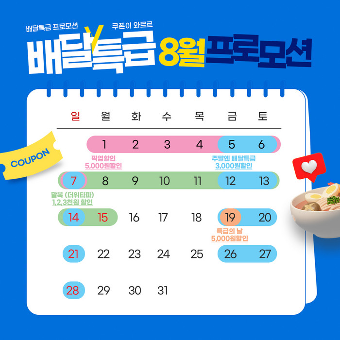 이에 오는 8월에는 ▲5,000원 할인쿠폰을 제공하는‘고양 특급의 날’ ▲배달비 지원 ▲3,000원 쿠폰을 제공하는 ‘주말엔 배달특급’▲휴가철 픽업 이벤트 ▲말복 더위타파 프로모션(8/7~8/15)등 풍족한 할인 혜택을 제공할 예정이다.