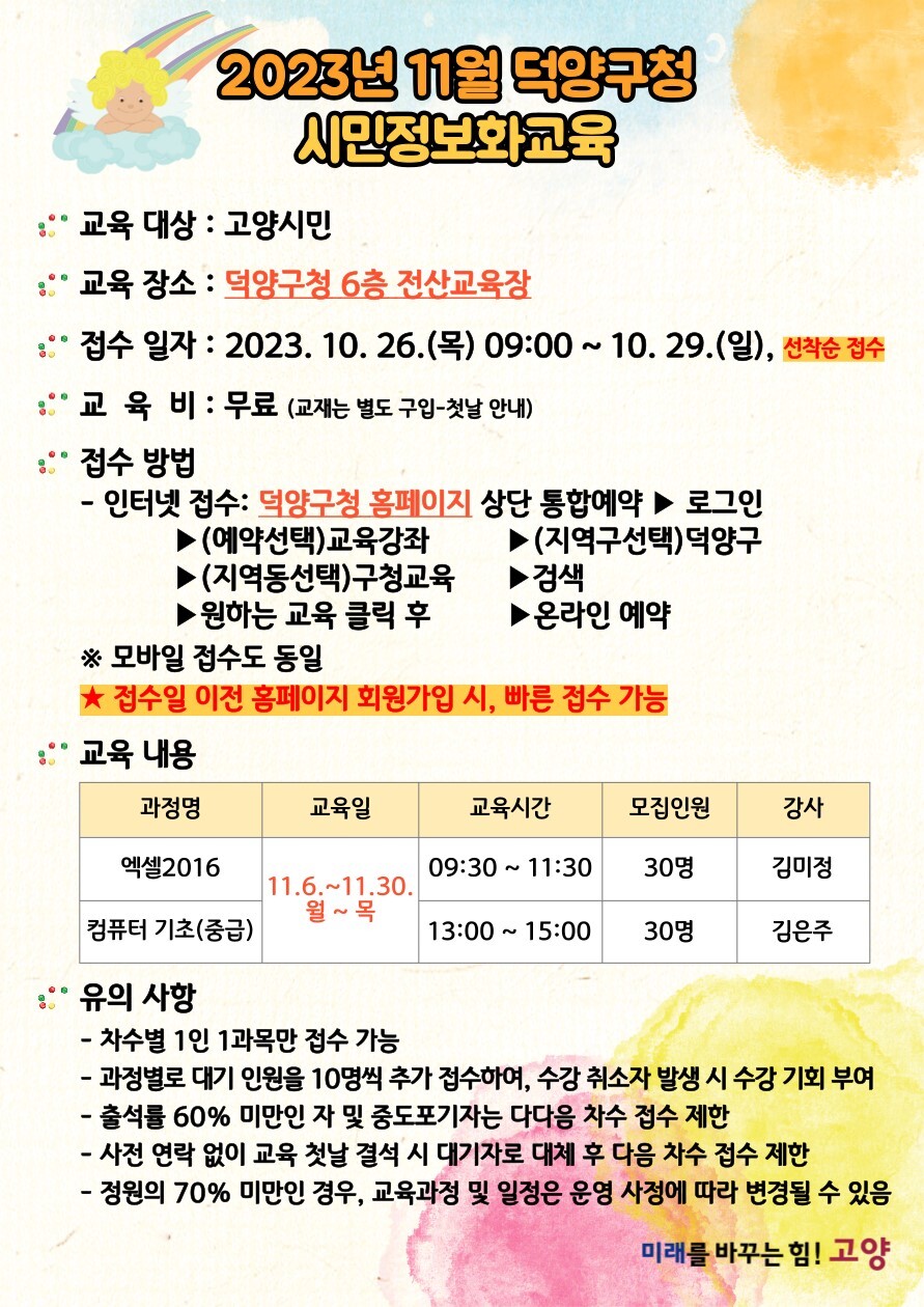 덕양구 정보화교육 담당자는 “교육 접수가 빠른 시간 안에 마감되니, 이번 교육과정을 신청하고 싶으신 분들은 9시 정각에 접수하실 것을 추천한다. 접수에 어려움이 있는 분들은 031-8075-5061로 전화 부탁드린다.”라고 전했다
