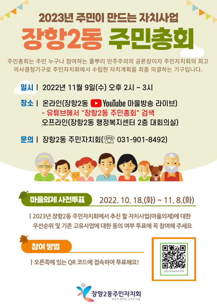 투표 대상은 장항2동 주민등록 거주자, 장항2동 소재 사업장·학교·기관·단체에 속해 있는 만 18세 이상 주민이며, 마을 곳곳에 배포된 홍보전단지 QR코드 스캔을 통해 10월 18일부터 주민총회 전날인 11월 8일까지 20일간 온라인으로 투표 참여가 가능하다.