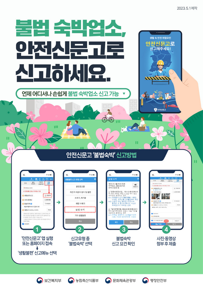 이를 해결하기 위해 관련부처 협업으로 행정안전부는 안전신문고에 ‘불법숙박’ 메뉴를 신설하여 지난 5월 1일부터 신고창구를 일원화했다.
