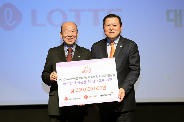 [부자동네타임즈 이동원기자]롯데는 21일 잠실 롯데시네마 월드타워관에서 대한적십자사에 저소득층 및 다문화 가정 산모를 지원하는 ‘mom편한 예비맘프로젝트’에 쓰일 3억 원을 기부했다. 이날 기부금 전달식에는 롯데지주 황각규 대표이사(사장), 롯데지주 오성엽 커뮤니케이션 실장(부사장), 대한적십자사 박경서 회장 등이 참석했다.