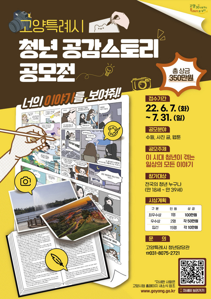 고양시 청년 공감스토리 공모전은 청년의 성공과 실패, 꿈과 도전, 일상 속 이야기 등 이 시대 청년들의 공감 스토리를 발굴⋅공유하여 청년 이슈에 대한 공감대를 형성하고 청년의 발전을 응원하기 위해 ‘고양시 청년 기본 조례’에 따라 추진하는 공모사업이다.
