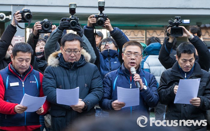 (서울=포커스뉴스) 7일 오전 서울 종로구 조계사 관음전 앞에서 민주노총 지도부가 한상균 위원장의 기자회견문을 대독하고 있다. 한 위원장은 이날 회견을 통해 노동법 개정 저지시까지 조계사에 계속 머물 것이라고 밝혔다.