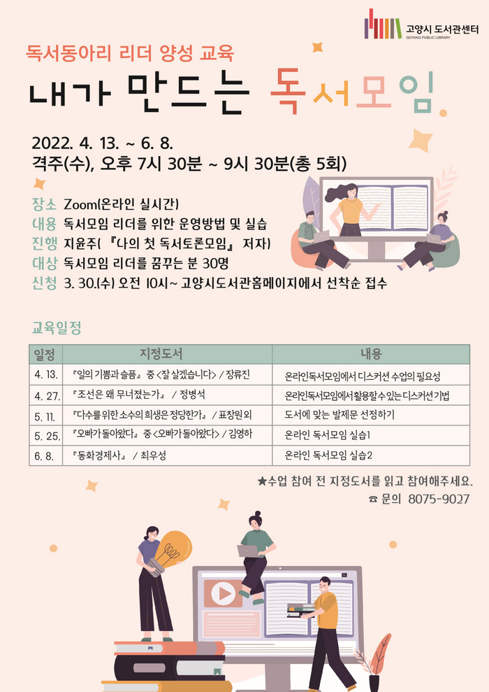 [부자동네타임즈 김인수기자] 고양시 도서관센터에서 4월 13일(수)부터 독서동아리 리더 역량 강화를 위한 교육프로그램 내가 만드는 독서모임을 진행한다.