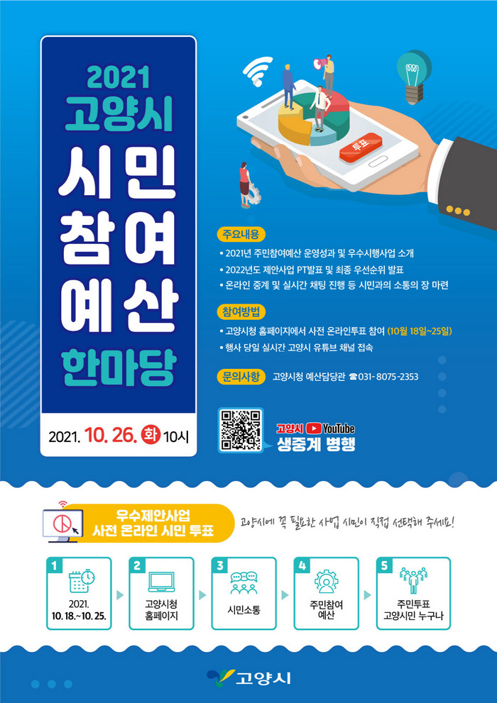 고양시 시민참여예산 한마당은 고양시가 시민이 제안하는 사업을 어떻게 실현하고 있는지 보여주는 장이다. 매해 대형 오프라인 행사로 개최되던 행사는 포스트코로나 시대에 맞추어 온택트 행사로 개편된 지난해에 이어 올해도 온라인으로 개최된다.