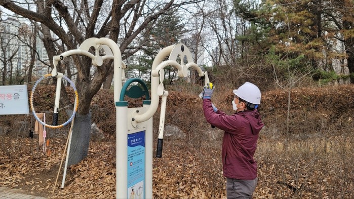 [사진설명] 고양시 주엽공원에서 공원관리원이 운동기구를 점검하고 있다.