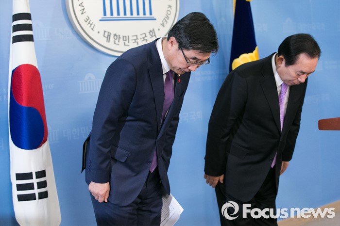 (서울=포커스뉴스) 이기권(왼쪽) 고용노동부 장관과 이인제 새누리당 노동시장선진화특별위원회 위원장이 7일 오전 서울 여의도 국회 정론관에서 노동개혁법안 처리 촉구 기자회견을 마치고 인사하고 있다.