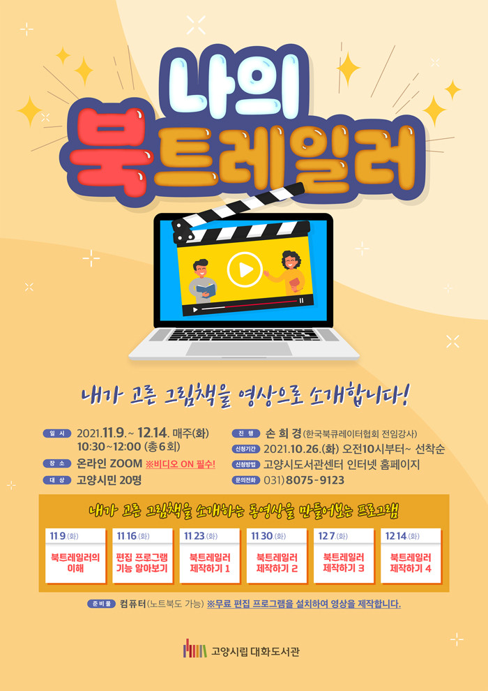 프로그램은 영상 제작 경험이 없는 시민도 참여할 수 있도록 영상 기획부터 편집까지 차근차근 배울 수 있도록 북트레일러의 이해, 동영상 편집 프로그램 기능 알아보기, 북트레일러 제작하기 1~4 순서로 진행된다.