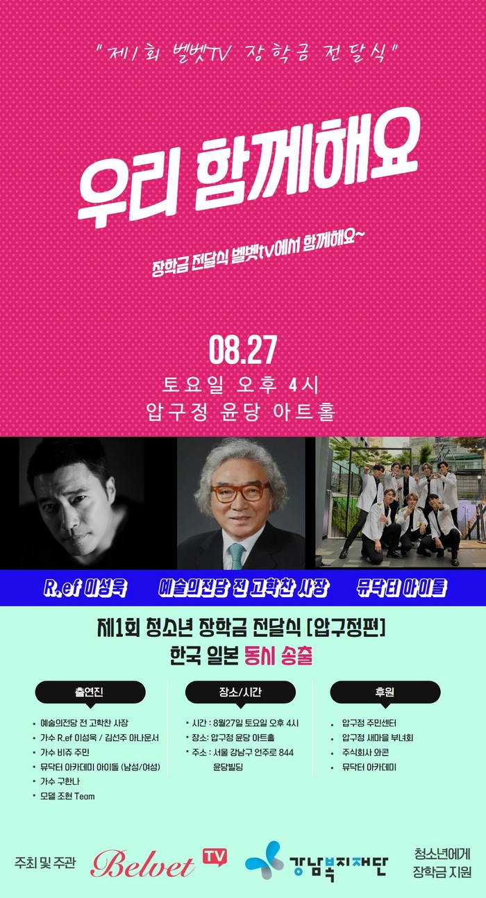 ‘우리 함께해요! 제1회 청소년 장학금 전달식(압구정 편)’은 벨벳TV 주최 및 주관으로 오는 8월 27일 토요일 오후 4시 압구정 윤당 아트홀에서 진행된다.