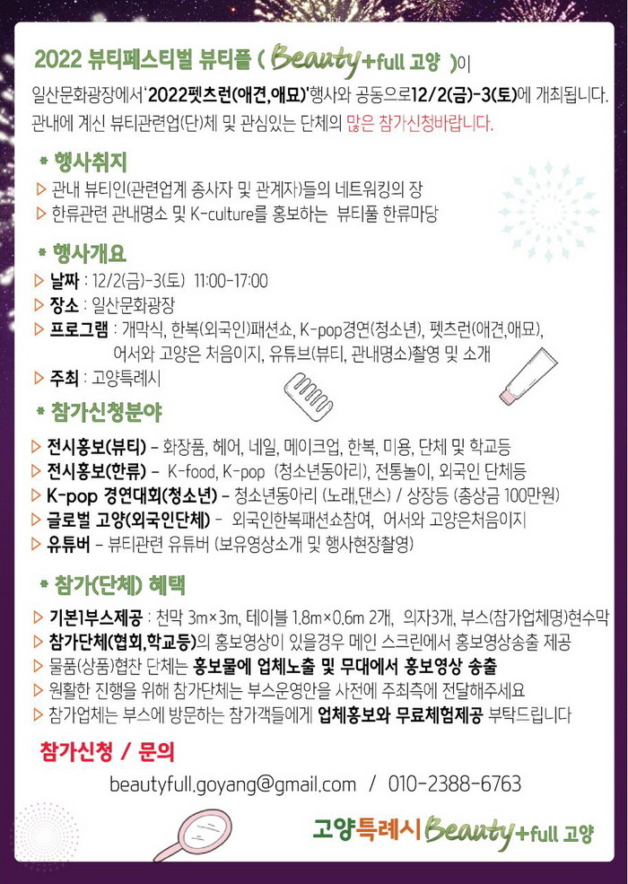 [부자동네타임즈 김인수기자] 고양특례시(시장 이동환)가 오는 12월 2일부터 3일까지 고양관광특구 일산문화광장에서 뷰티 테마 한류 페스티벌 ‘2022 뷰티풀(Beauty Full) 고양’을 개최한다.