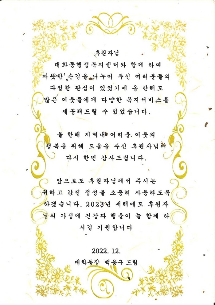 서한문에는 어려운 이웃들을 위해 물심양면으로 나눔을 실천해주신 후원자들의 따뜻한 마음에 대한 감사와 대화동에 대한 지속적인 관심과 사랑을 당부하는 내용이 담겼다.