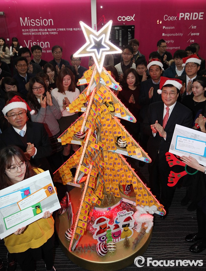 (서울=포커스뉴스) 코엑스 변보경 사장과 임직원들이 3일 오전 서울 강남구 코엑스에서 칭찬으로 만든 트리 점등식을 하고 있다. 코엑스는 일상 속에서 사내에 긍정의 에너지와 소통문화를 확산하기 위해 칭찬카드 제도를 운영하고 있다.