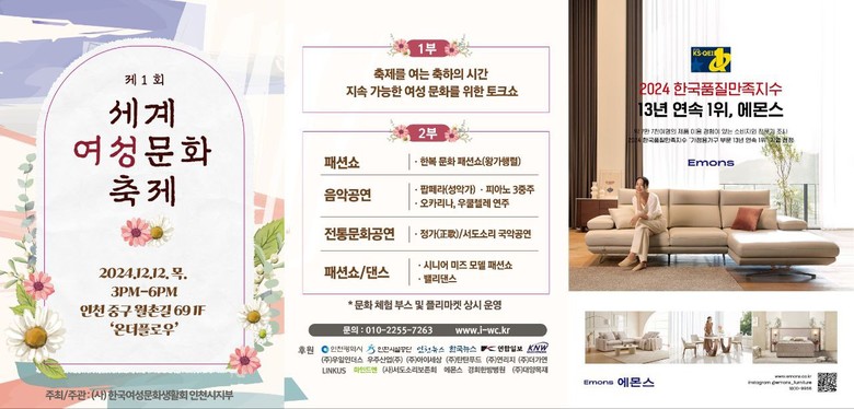 지난 12일 인천 중구 영종국제도시에서 열린 ‘제1회 세계여성문화축제’가 성황리에 종료됐다. 이번 행사는 (사)한국여성문화생활회 인천시지부(회장 이시현)가 주최 및 주관하고 인천광역시가 후원하여 여성들이 함께하는 다양한 문화를 경험하고 이해를 증진하는 기회를 제공했다.