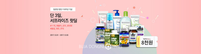 [부자동네타임즈 김현정 기자]KGC인삼공사는 창업기념일을 맞아 12월 1일부터 3일간 ‘정관장몰에서 국내외 건강기능식품 및 화장품 11종을 8,000원에 한정수량 판매하는 행사를 진행한다고 밝혔다.