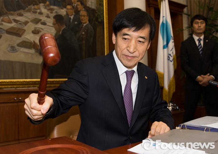 | △ 10일 오전 서울 중구 한국은행에서 열린 금융통화위원회에서 이주열 한국은행 총재가 회의 시작을 알리는 의사봉을 두드리고 있다. <사진제공=포커스뉴스> |
