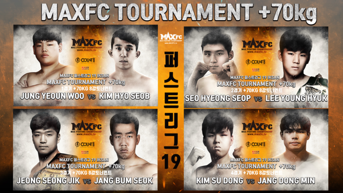 한편 MAXFC ‘퍼스트리그 19 무제한급 원데이 토너먼트’ 대회는 5월 1일 오후 1시 전북 익산 칸스포츠 특설링에서 개최된다. 코로나19로 인해 무관중으로 진행되며, MAXFC 유튜브 채널에서 생중계된다.