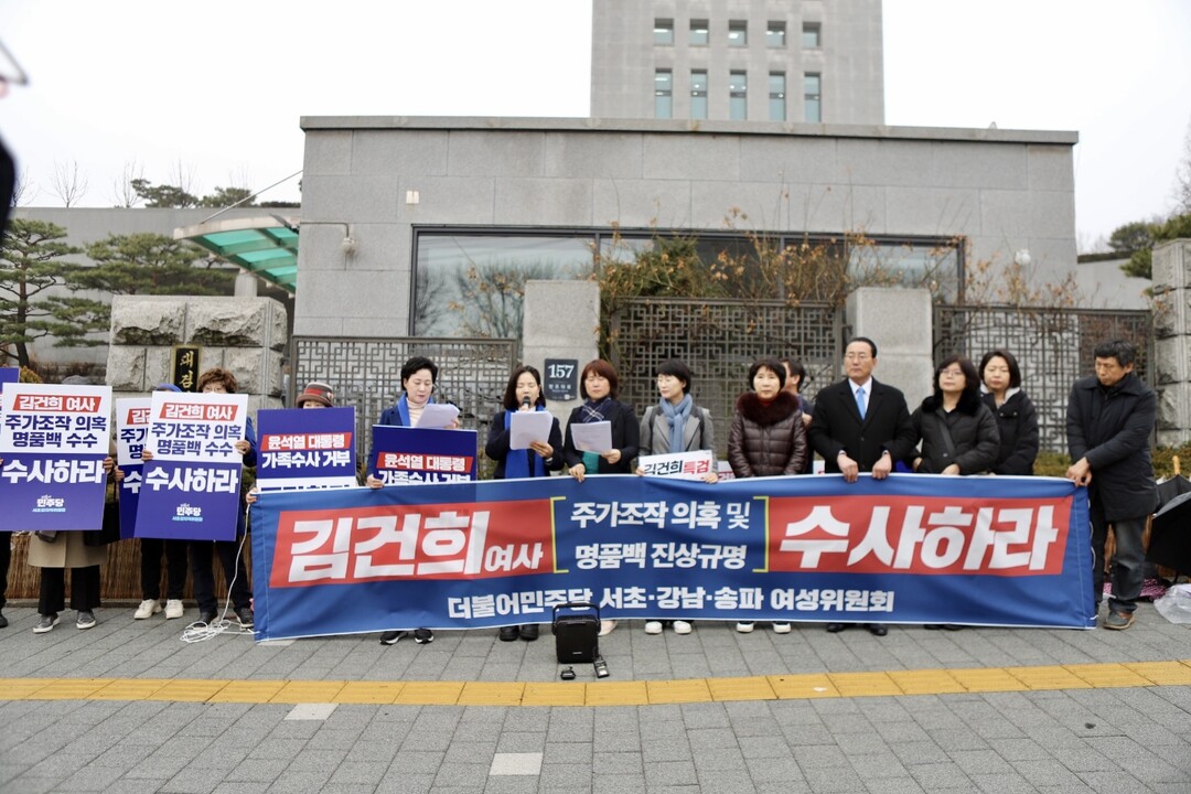 [부자동네타임즈 = 김인수 기자] 더불어민주당 서초, 강남, 송파 이른바 ‘강남 3구’ 여성위원회는 지난 19일 오전 11시 대검찰청 앞에서 ‘김건희 여사 주가조작 의혹 및 명품백 진상규명을 위한 수사 촉구 기자회견’을 개최했다.