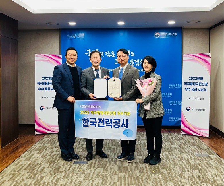한국전력공사(사장 김동철, 상임감사위원 전영상)는 21일(목) 국민권익위원회에서 주최하는 ‘2023년도 적극행정국민신청 유공’ 시상식에서 ‘우수기관’ 및 ‘우수직원(감사실 심지은 차장)’ 2개 부문에서 국민권익위원장상을 수상하였다.