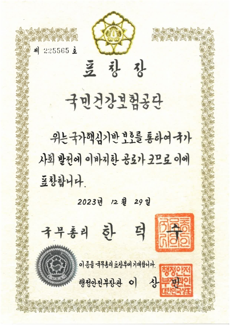 공단의 국민건강보험정보시스템은 2013년부터 정보통신분야 국가핵심기반으로 지정되었고, 화재‧정전 등 각종 재난에 대비하여 시스템의 기능연속성 유지를 위한 공단의 꾸준한 노력을 인정받아 재난관리평가 A등급 달성과 동시에 국무총리 표창을 수상했다.