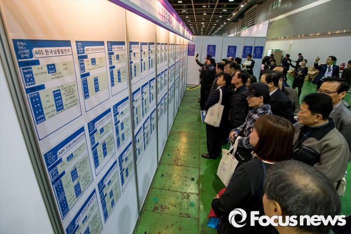| △ 이달 10일 오전 서울 서초구 강남대로 aT센터에서 열린 '2015 서울시 중장년 구직자 채용 박람회'에서 구직자들이 채용게시판을 보고 있다. <사진제공=포커스뉴스> |