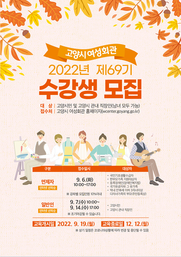 69기 정규 강좌는 9월 19일부터 12월 12일까지 진행된다. 수강료는 강좌마다 상이하며, 재료비는 수강생이 별도로 부담 한다. 기타 강좌별 시간표, 강사 프로필 및 강의계획서 등 자세한 사항은 고양시 여성회관 홈페이지에서 확인하면 된다.
