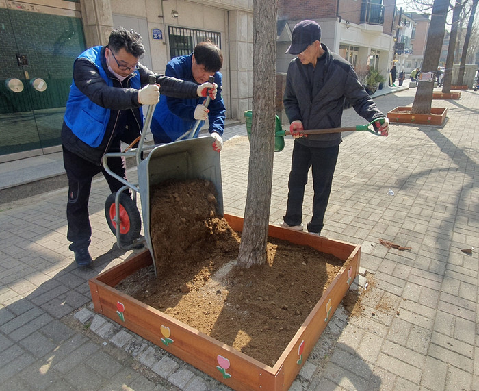 [부자동네타임즈 김인수기자] 지난 21일 오전, 고양특례시 일산동구 정발산동 주민자치회(회장 윤만승)와 정발산동 통장, 춤추는 빗자루, 정발산동 주민들이 모두 힘을 합쳐 작년 밤리단 보넷길에 설치한 41개 가로수 보호틀에 흙을 보충하는 작업을 진행했다.