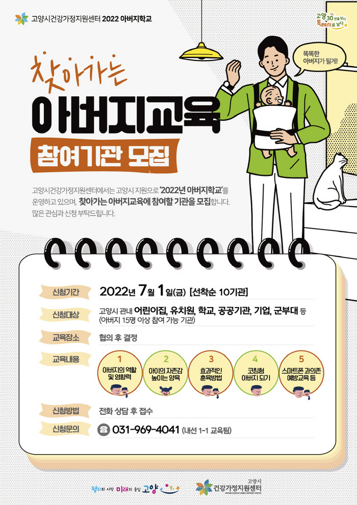 [부자동네타임즈 김인수기자] 고양시 건강가정지원센터가 7월 1일(금)부터 관내 어린이집, 유치원, 학교, 기업, 군부대 등을 대상으로 찾아가는 아버지 교육 참여 기관을 모집한다.