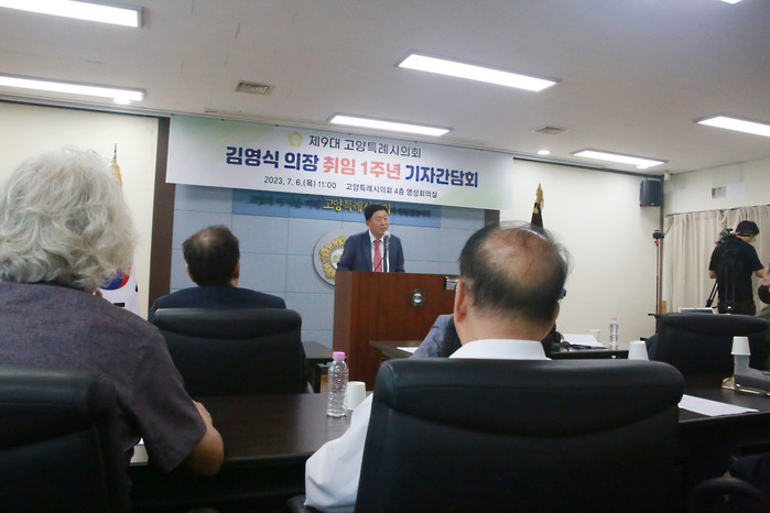 [부자동네타임즈 김인수기자] 고양특례시의회(의장 김영식)는 6일 의회 영상회의실에서 제9대 고양특례시의회 의장 취임 1주년 기자간담회를 갖고 그동안의 의정 성과와 남은 1년 의장으로서 포부를 전했다.