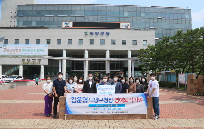 [부자동네타임즈 김인수기자] 고양시 덕양구(구청장 김운영)는 "지난 6월 23일 ㈜소프리(대표 이승철), ㈜영이너폼(대표 이종덕)에서 코로나19를 극복을 기원하고 김운영 덕양구청장의 명예퇴직을 기념하기 위해 마스크 200,000매를 기탁했다."고 밝혔다.