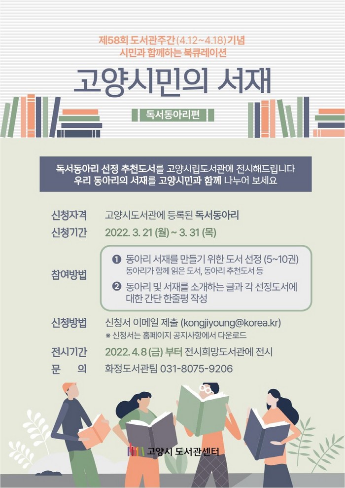 [부자동네타임즈 김인수기자] 고양시 도서관센터에서 제58회 도서관주간(4.12.~4.18.)을 맞아 시민이 참여하여 함께 만드는 북큐레이션 고양시민의 서재를 운영한다고 밝혔다.