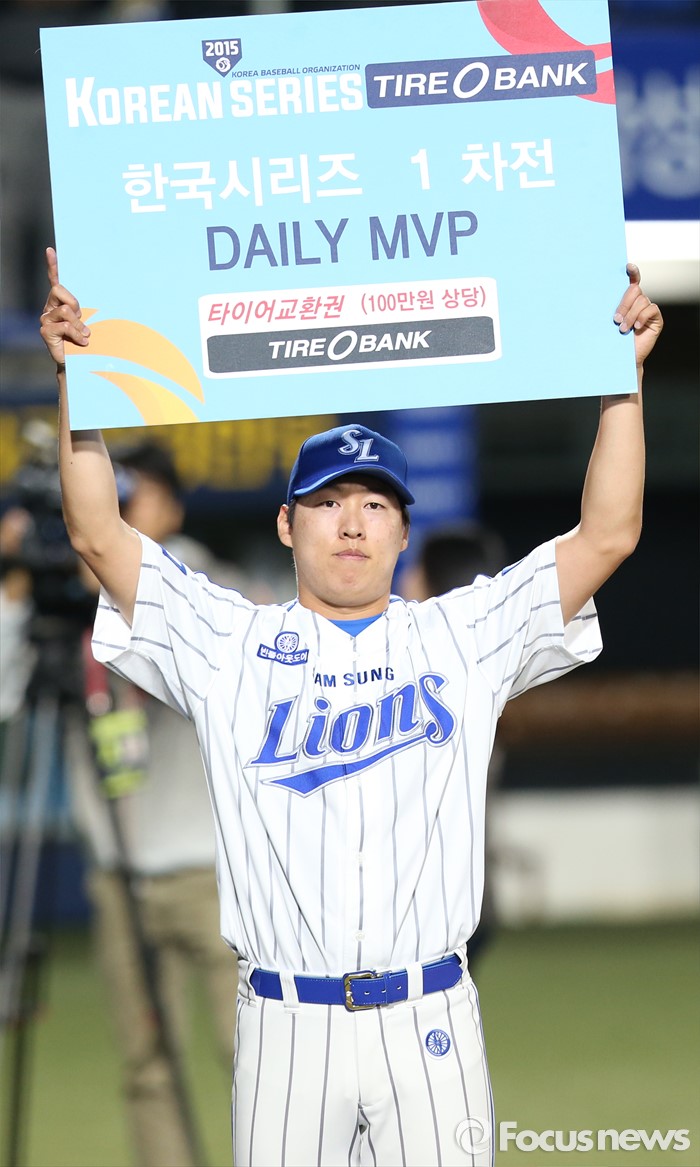 (서울=포커스뉴스) 26일 대구 시민구장에서 열린 2015 프로야구 포스트시즌 두산-삼성 한국시리즈 1차전에서 세이브를 따내며 데일리 MVP로 선정된 삼성 차우찬이 상패를 들어 보이고 있다.