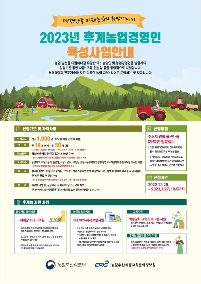 신청 자격은 만 18세 이상 만 50세 미만(1973. 1. 1 ∼ 2005. 12. 31. 출생자)으로 농업계 학교를 졸업(예정자 포함)하였거나 농업 교육 기관에서 관련 교육을 이수하고, 독립 영농경력 10년 이하의 농업인이다.