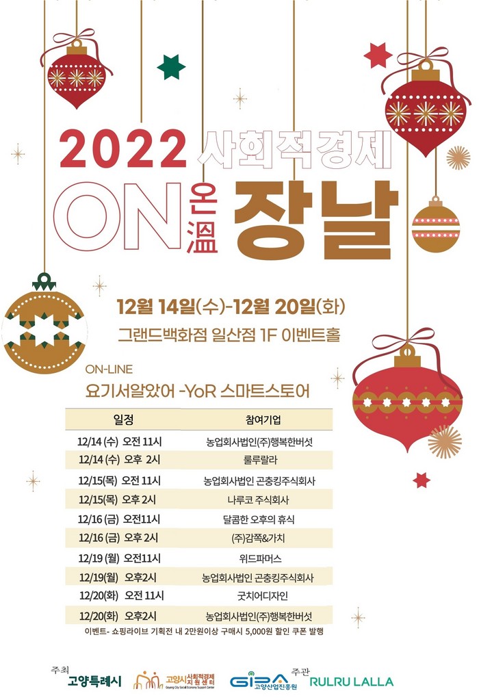 [부자동네타임즈 김인수기자] 고양특례시(시장 이동환)는 오는 12월 14일(수)부터 20일(화)까지 7일간 고양시 일산서구 그랜드백화점 1층 이벤트홀과 온라인에서 ‘2022 사회적경제 ON온(溫)장날’을 운영한다.