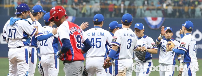 | △ 지난 4일 오후 서울 구로구 고척스카이돔에서 열린 2015 서울 슈퍼시리즈 대한민국과 쿠바의 경기에서 6:0으로 승리한 대한민국 선수들이 기뻐하고 있다. 조종원 기자 choswat@focus.kr |