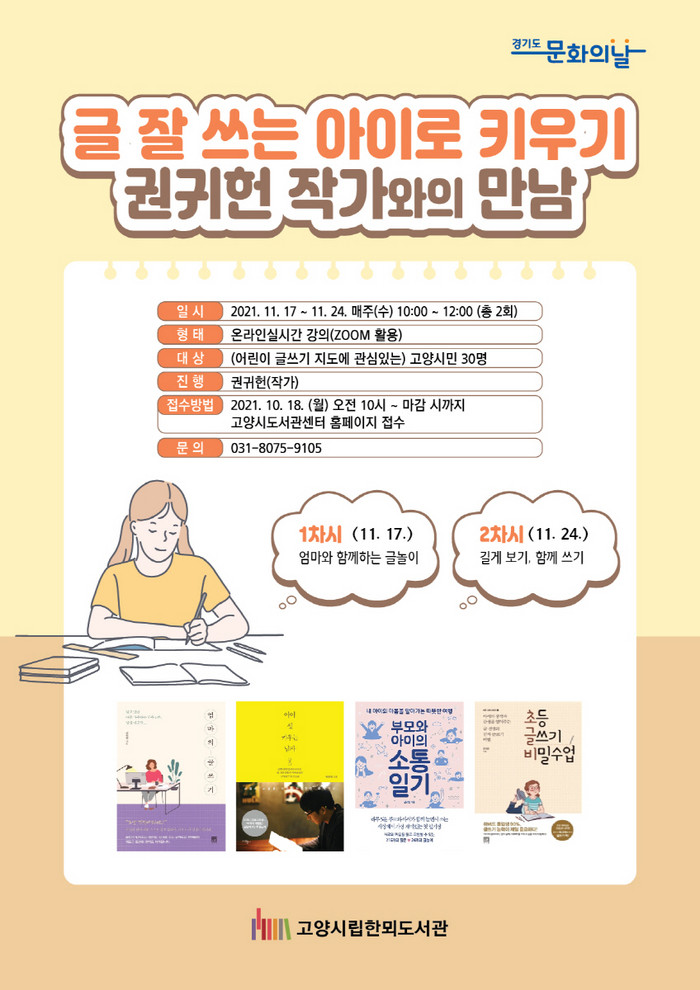 [부자동네타임즈 김인수기자] 고양시 한뫼도서관이 11월 17일(수)와 11월 24일(수) 오전 10시부터 12시까지 총 2회에 걸쳐 권귀헌 작가와의 만남 ‘글 잘 쓰는 아이로 키우기’ 프로그램을 온라인으로 운영한다.