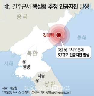 3일 기상청 국가지진화산종합상황실에 따르면 낮 12시29분께 북한 함경북도 길주 북북서쪽 40㎞ 지역에서 인공적으로 발생한 것으로 추정되는 지진이 발생했다.