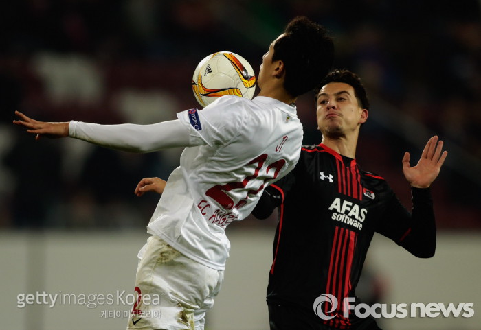 | △ <아우크스부르크/독일=게티/포커스뉴스> 아우크스부르크 소속 지동원이 6일 새벽(한국시간) 홈에서 열린 AZ알크마르와의 유로파리그 조별라운드 경기에서 상대 선수와 공 소유권을 다투고 있다. (C)게티이미지/멀티비츠 |