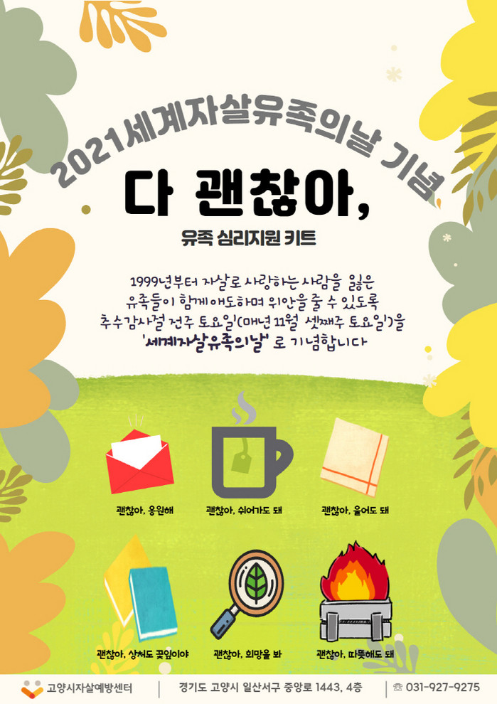 [부자동네타임즈 김인수기자] 고양시 자살예방센터(센터장 박선영)가 11월 20일 세계 자살유족의 날을 기념하여 다 괜찮아, 유족심리지원키트를 지원한다.