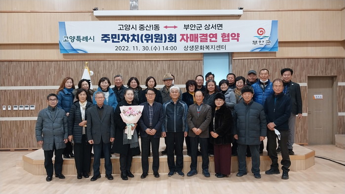 [부자동네타임즈 김인수기자] 고양특례시 일산동구 중산1동 주민자치회(회장 유광석)와 전라북도 부안군 상서면 주민자치위원회(위원장 최기현)는 11월 30일 부안군 상서면 상생문화복지센터 2층 강당에서 자매결연 협약을 체결했다.