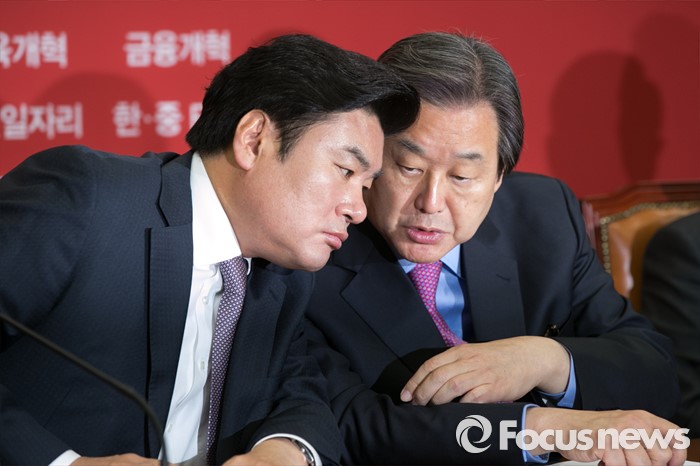 | △ 김무성(오른쪽) 새누리당 대표와 원유철 원내대표가 19일 오전 서울 여의도 국회에서 열린 최고위원회의에 참석해 논의하고 있다. <사진제공=포커스뉴스> |